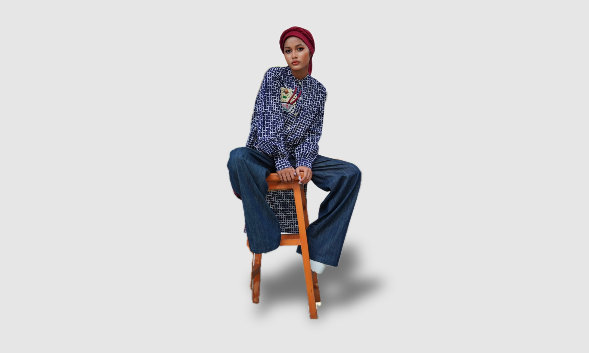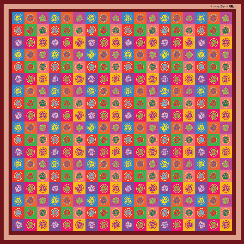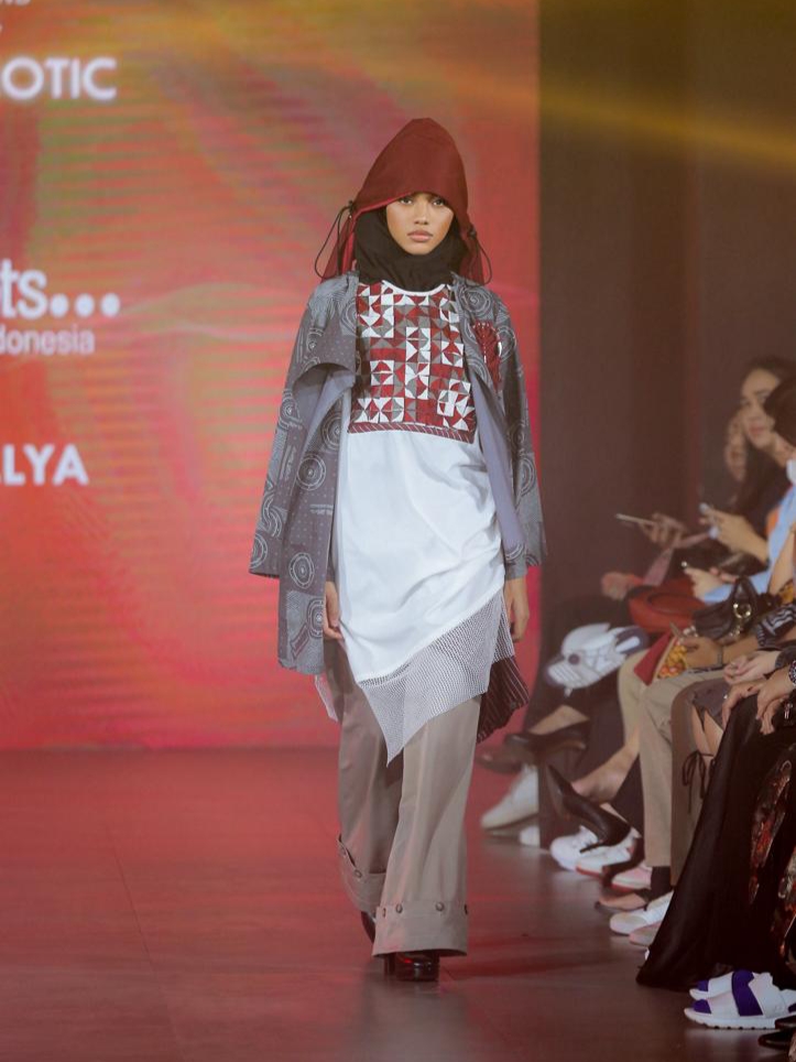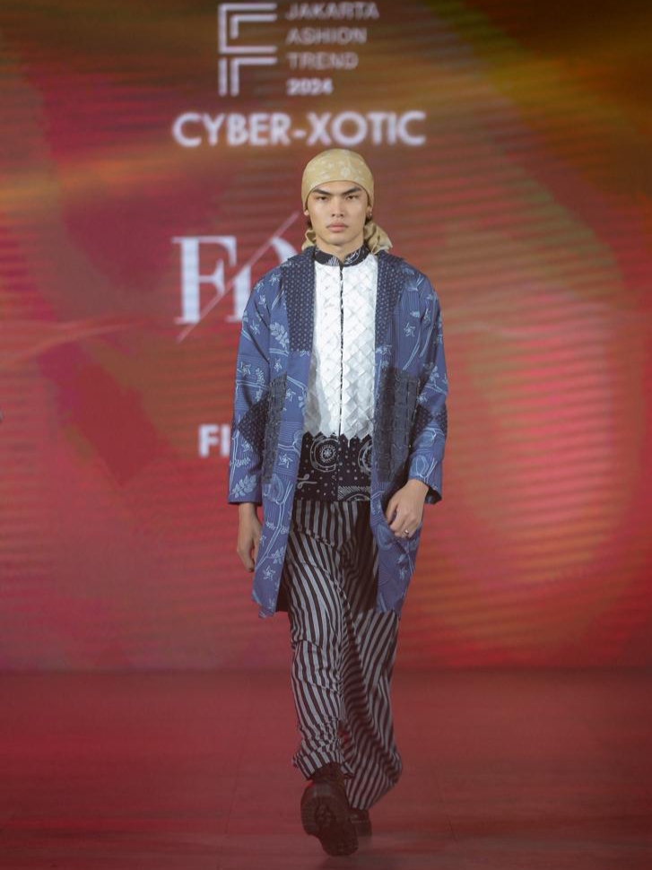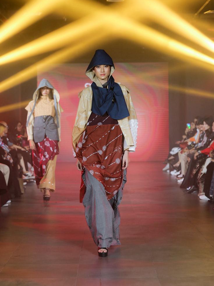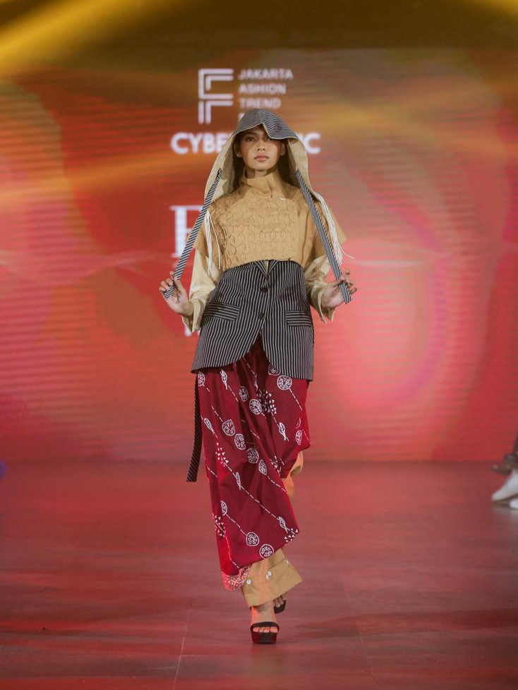 The pop art kembang goyang scarf gives the outfit a professional touch, creating a beautiful and energetic look.